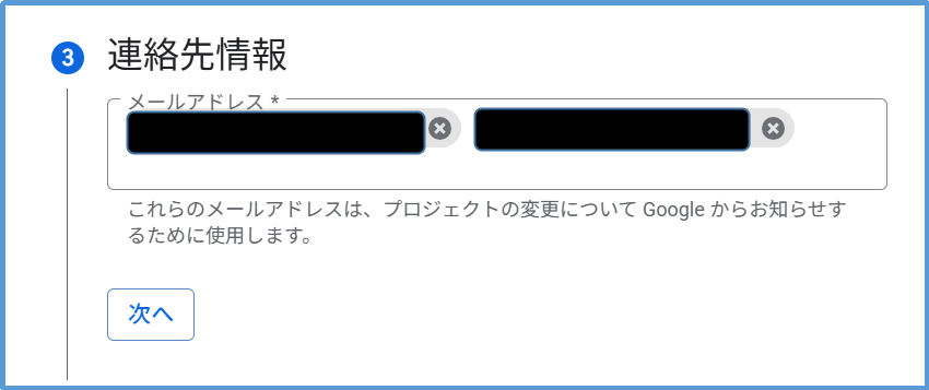 連絡先となるメールアドレスを入力。ここは複数指定可能な模様。