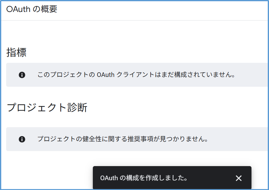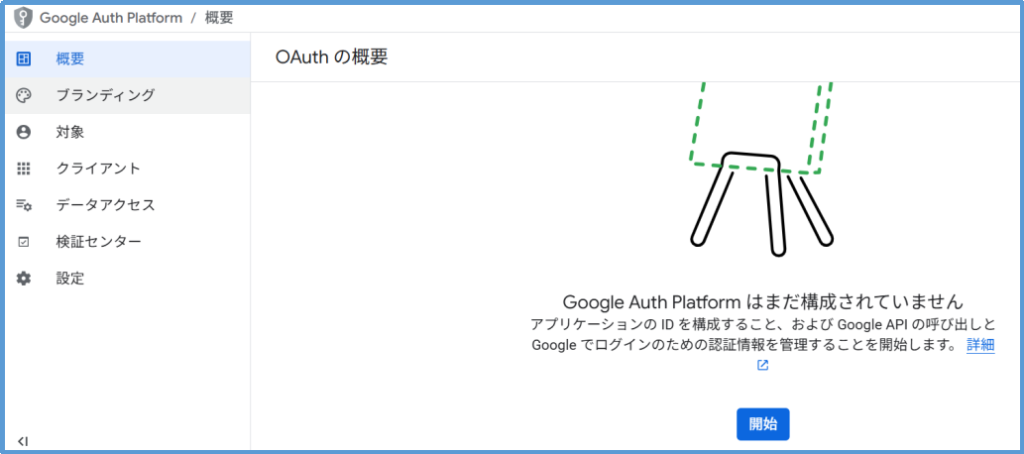 ④ 作成したプロジェクトで引き続き「OAuth 同意画面」の設定を行います。左メニューの「OAuth 同意画面」をクリック。表示された画面の「開始」ボタンをクリック。
