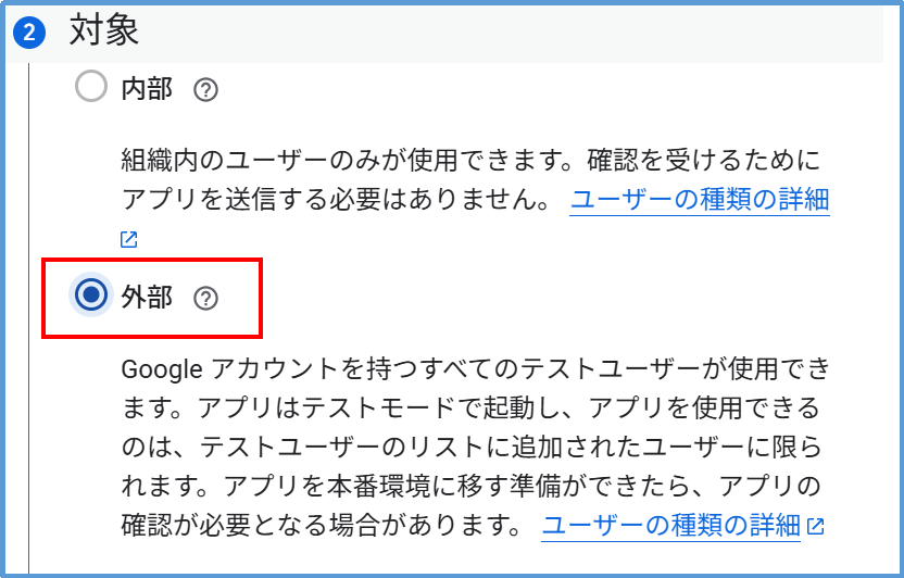 「外部」を選択。※「内部」は組織アカウント専用なので、個人は「外部」になるとのこと。