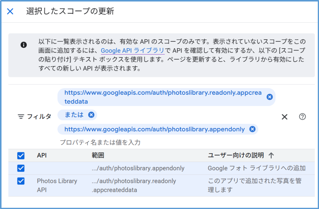 ⑧ フィルタされたスコープのうち「…./photoslibrary.appendonly」または「…./photoslibrary.readonly.appcreateddata」を選択状態にします。すると2つのスコープにチェックが入った状態になります。※ここで一覧に表示されない場合には、前述のAPIの有効が正しく実行されていない可能性があります。
