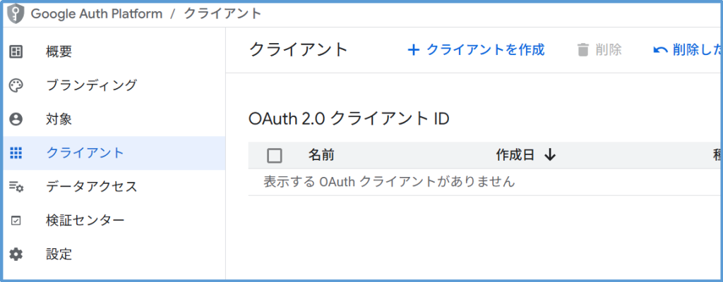 ⑫ 左メニュー「クライアント」を選択し、表示された画面内の「新しいクライアントを作成」をクリック。