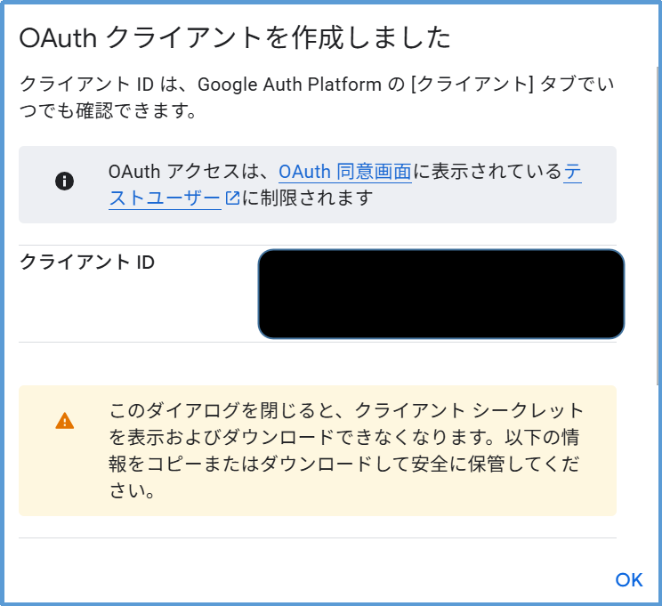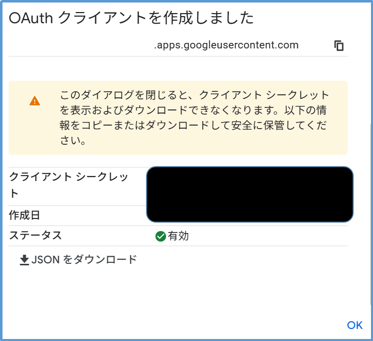 ⑭ クライアントIDとクライアントシークレットが発行されます。コピーするか、JSONをダウンロードを実行し、情報を保持します。