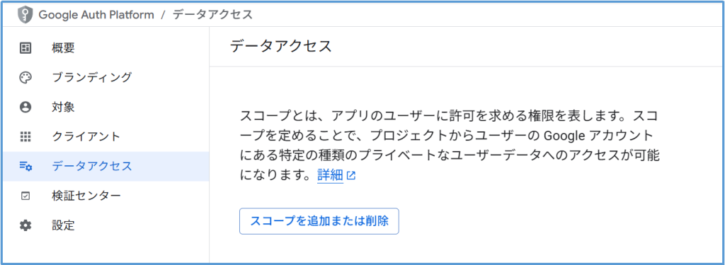 ⑥ 左メニューの「データアクセス」を選択します。そこで表示された画面内の「スコープを追加または削除」ボタンをクリックします。