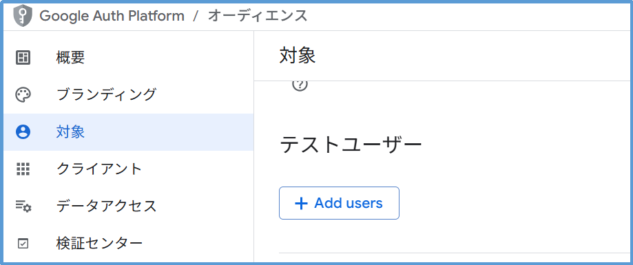 ⑩ 左メニュー「対象」画面内にある「テストユーザ」ボタンをクリック。