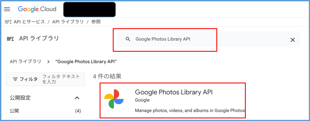② 作成したプロジェクトを選択状態にしたら、[APIライブラリ]の検索窓から「Google Photos Library API」を検索。選択後の画面で「有効にする」をクリック。