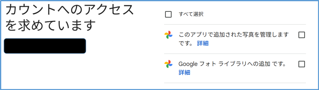 このサンプルコードが「Google Photo」へのアクセスを求めるため、チェックONにして「続行」
