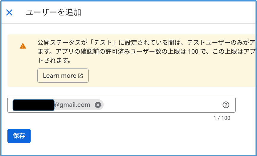 ⑪ 右側にタブが表示されますので、ボックスの中にGoogle Photoで利用しているGmailアカウントを入力し、「保存」ボタンをクリック。