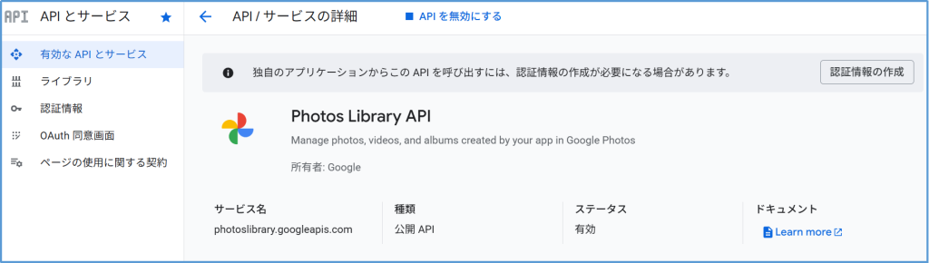 ③ 「有効なAPIとサービス」に画面が遷移され、Photos Library APIが表示された状態に。