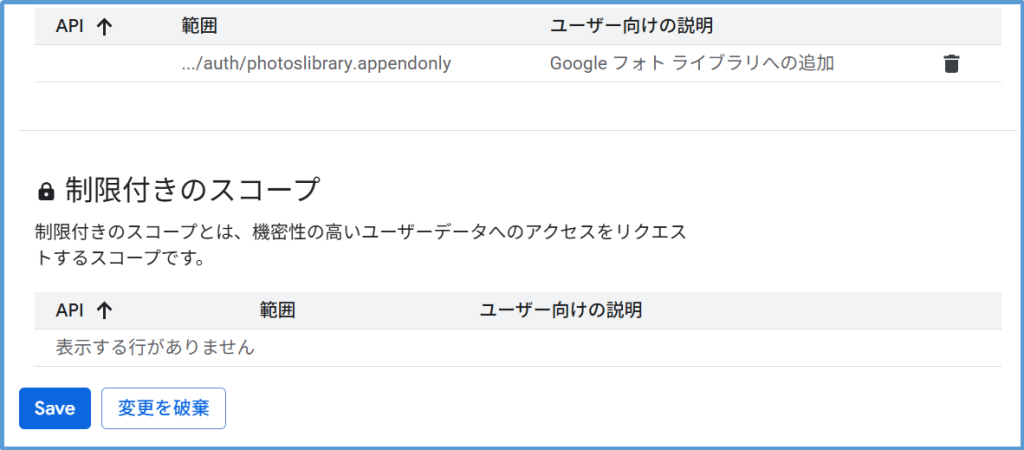 前述の「/photoslibrary.readonly ではなく /photoslibrary.readonly.appcreateddata です。」という記述。スコープ「readonly.appcreateddata」を指定することで「当アプリでアップロードした画像に関してのみ参照ができる」という状態になります。